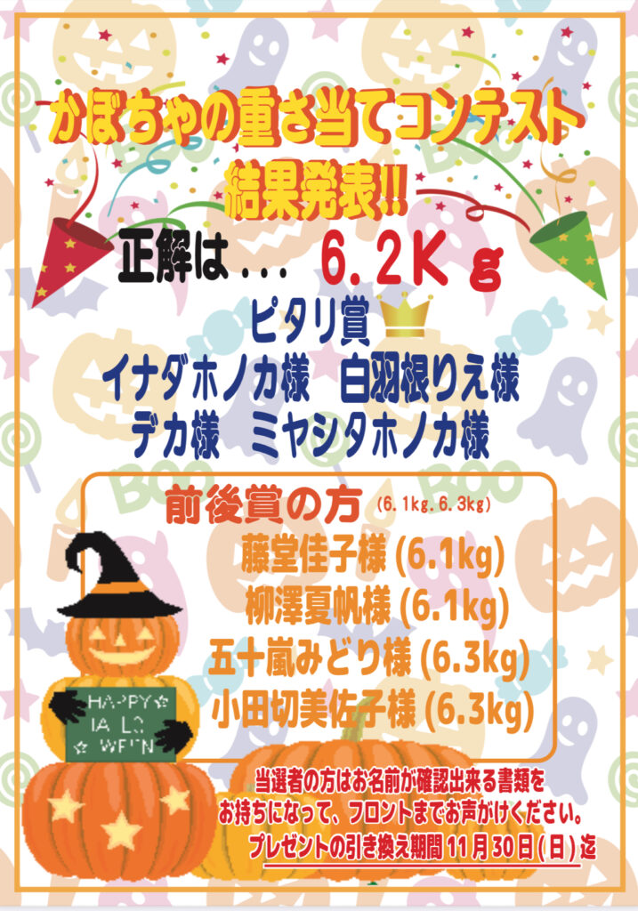 かぼちゃの重さ当てコンテスト結果発表! ピタリ賞の方おめでとうございます☆ フロントで景品をお受け取り下さい♪