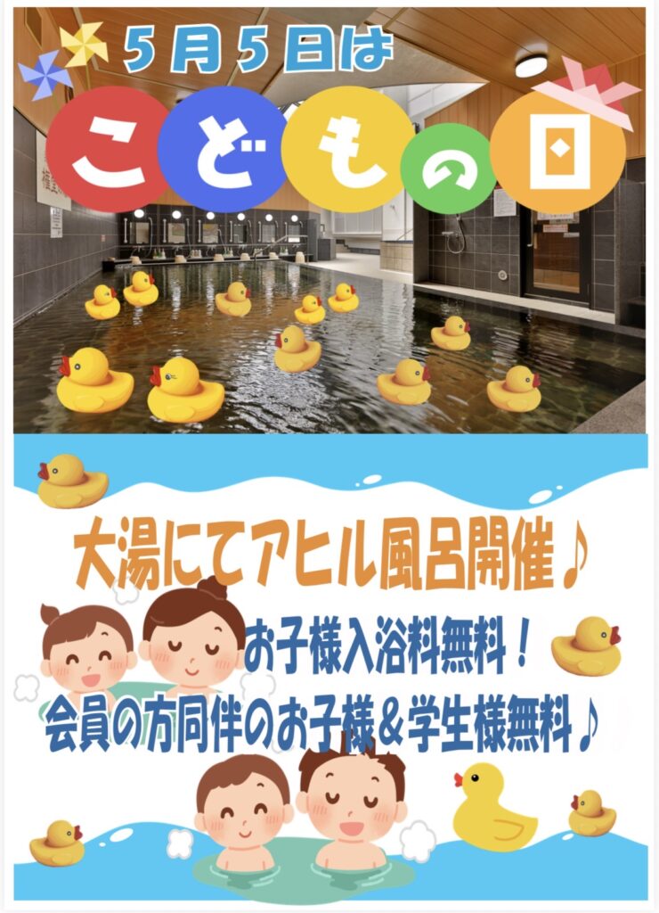 5月5日は子どもの日☆ 小学生以下はなんと無料で入浴できちゃいます! 大湯にはアヒル隊長もいますので是非お子様とお楽しみ下さい♨