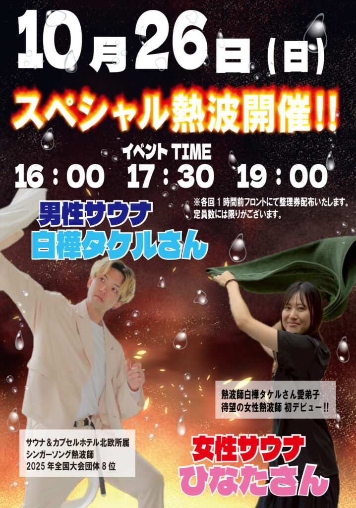 スペシャル熱波 日本トップレベルのアウフギーサー白樺タケルさん、そして愛弟子ひなたさん記念すべき初デビューのスペシャル熱波イベントを開催致します! 長野では滅多に受けられない激レアイベントです♨ 是非ご参加下さい♪